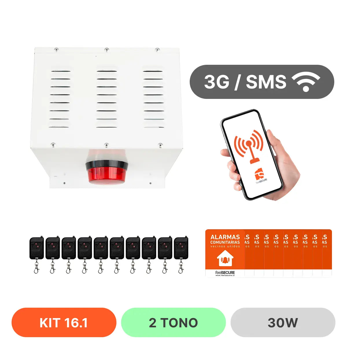 Kit 16.1 Alarma Comunitaria 30W 2 Tonos con Modulo 3G Envia SMS con Información del Vecino que Activa + 10 Controles + 10 Placas | FeelSecure