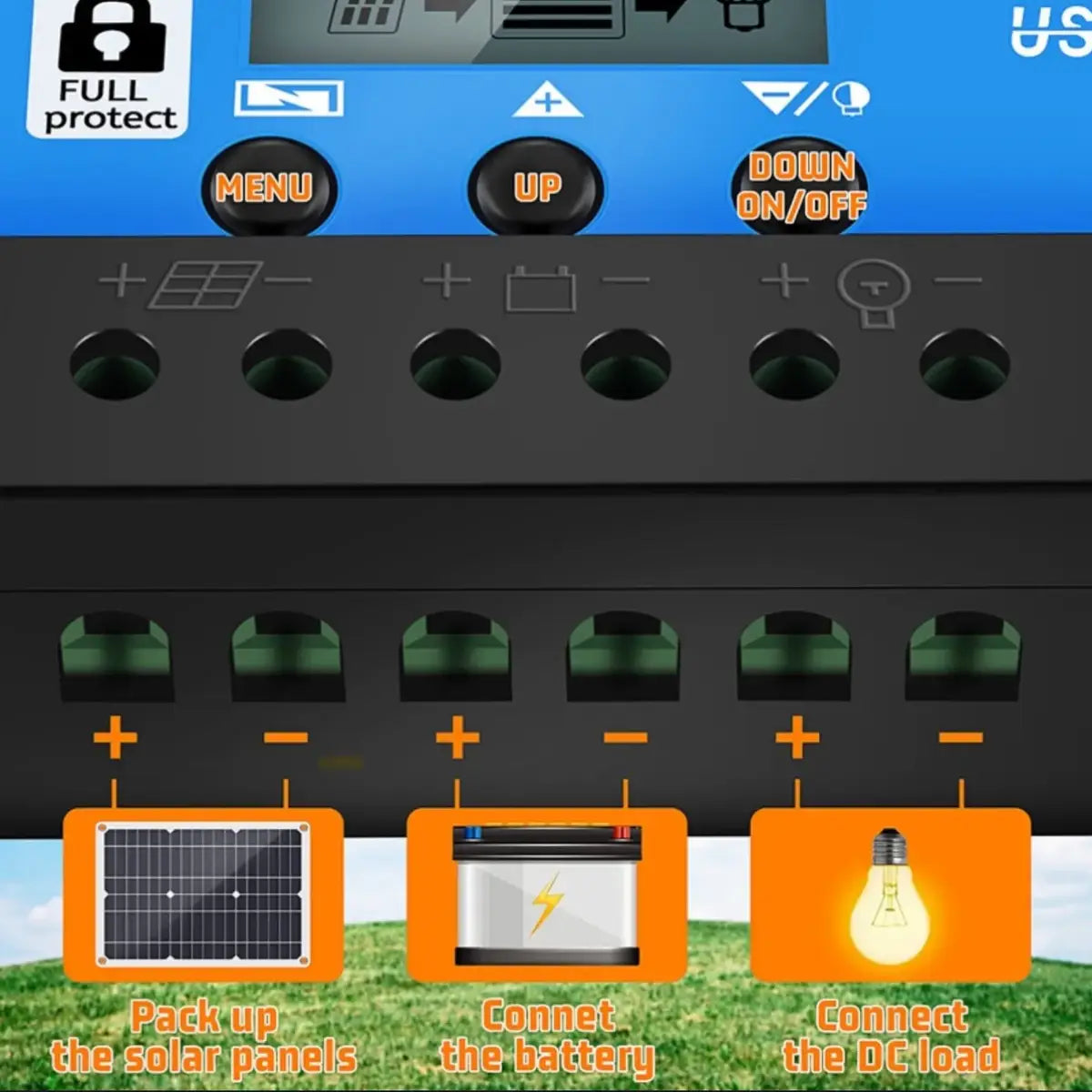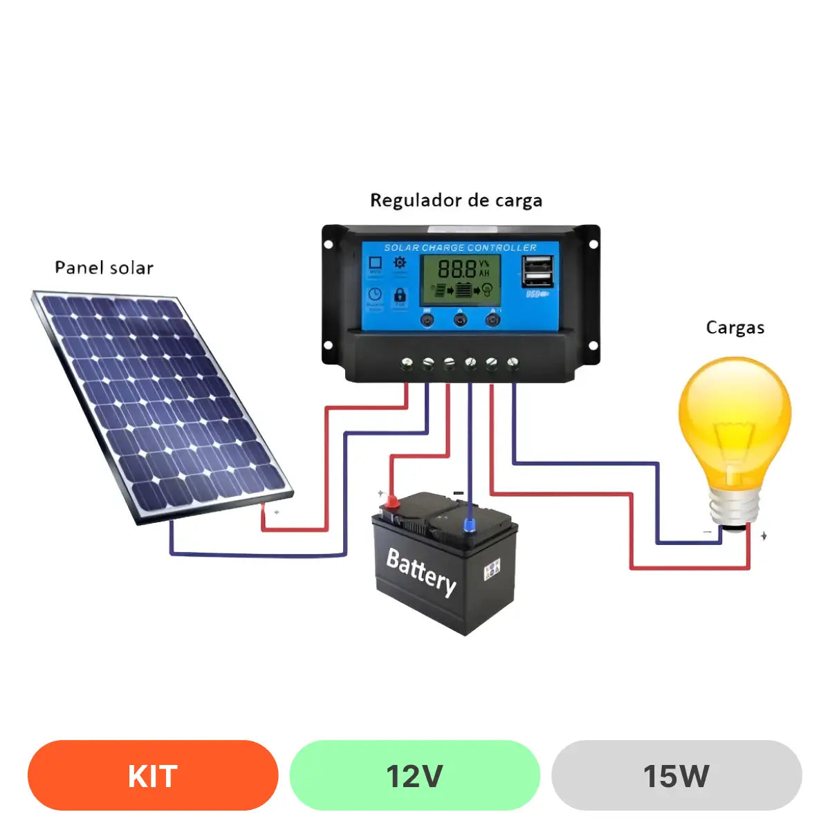 • Regulador de Carga PWM: Protege tu batería y regula el flujo de energía entre el panel, la batería y los dispositivos conectados.