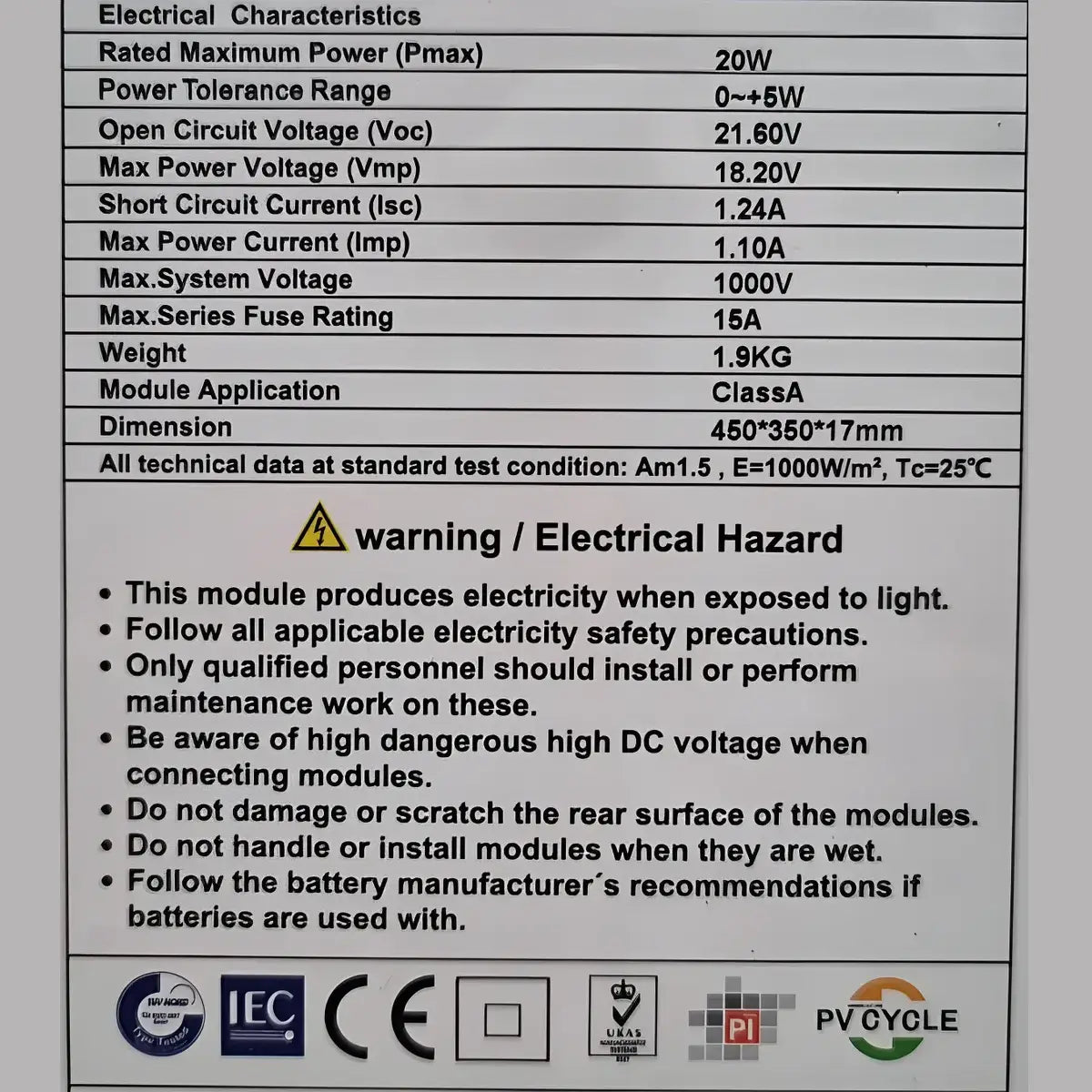 • 1 Panel Solar Original 20W con Cable Uso Exterior + y - para conectarse al regulador de carga -