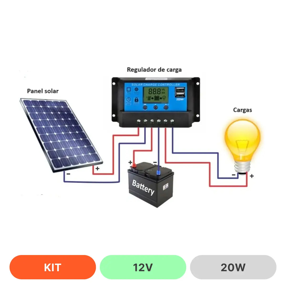 Kit Panel solar listo para conectar dispositivos de 12V DC, incluye panel solar de 20W, regulador de carga PWM y batería de 12V 4Ah. Somos los únicos que incluimos cables con borner para una conexión directa y segura hacia la batería, además del cable del panel solar para conexión directa al regulador.