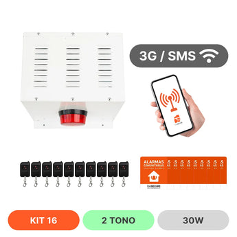 Kit 16 Alarma Comunitaria 30W 2 Tonos con Modulo 3G Envia SMS con Información del Vecino que Activa + 10 Controles + 10 Placas | FeelSecure