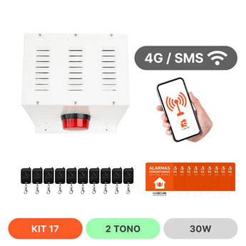 Kit 17 Alarma Comunitaria 30W 2 Tonos con Módulo 4G Envía SMS con Información del Vecino que Activa + 10 Contoles + 10 Placas | FeelSecure