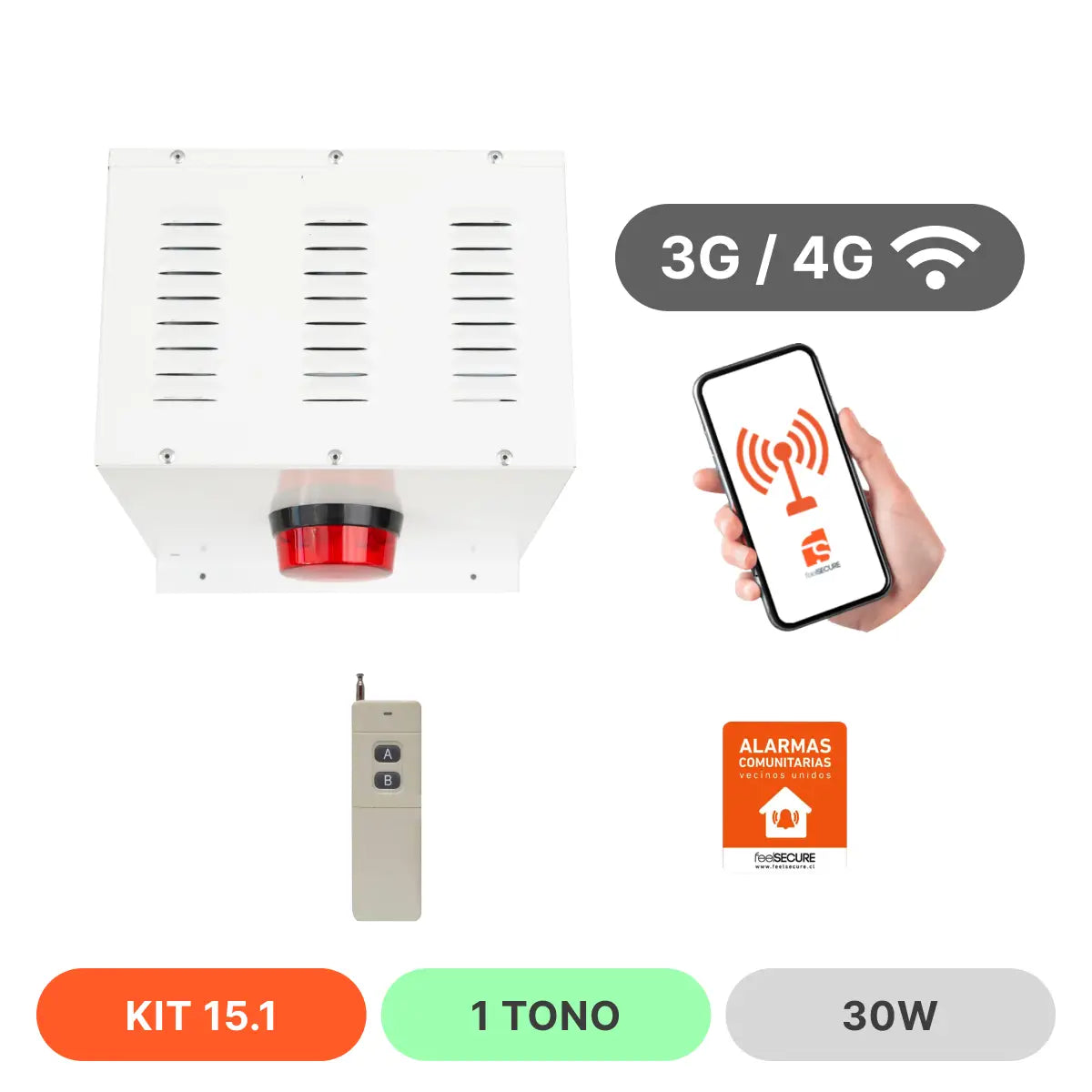 Kit 15.1 Alarma Comunitaria 30W 3G/4G 200 Usuarios Activación Llamada Telefonica + 1 Control Larga Distancia | FeelSecure