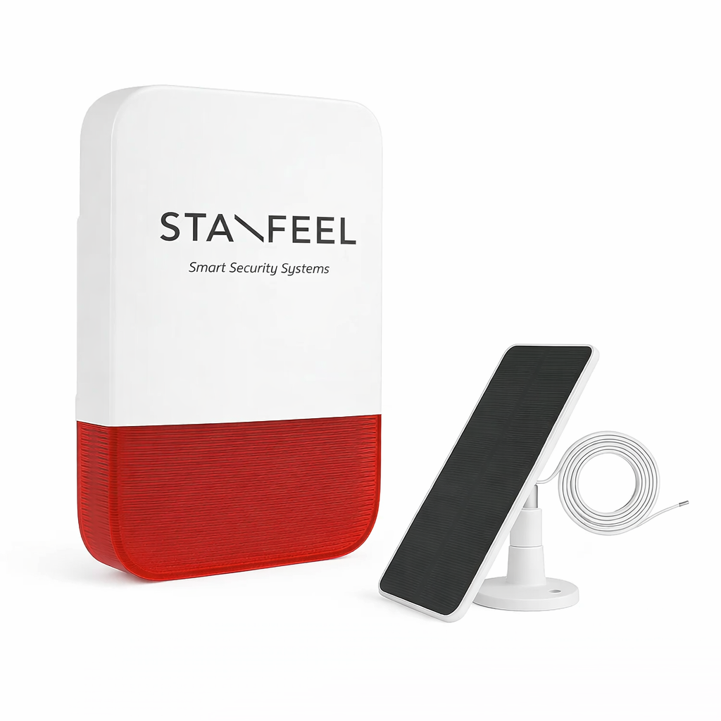 Sirena Exterior Solar de fácil instalación que se conecta a las centrales de Alarmas StanFeel y funcionan en modo de seguridad en casa, ausente, desarmado y sos. Al activar la alarma enviara notificación a todas las personas que se configuraron en la central y activara la sirena exterior inalámbrica. Gracias a su tecnología de panel solar, puede ser auto-instalado en cualquier sector de la vivienda con orientación norte para la correcta alimentación de los rayos UV. Solo compatible con las centrales de Alarmas StanFeel.